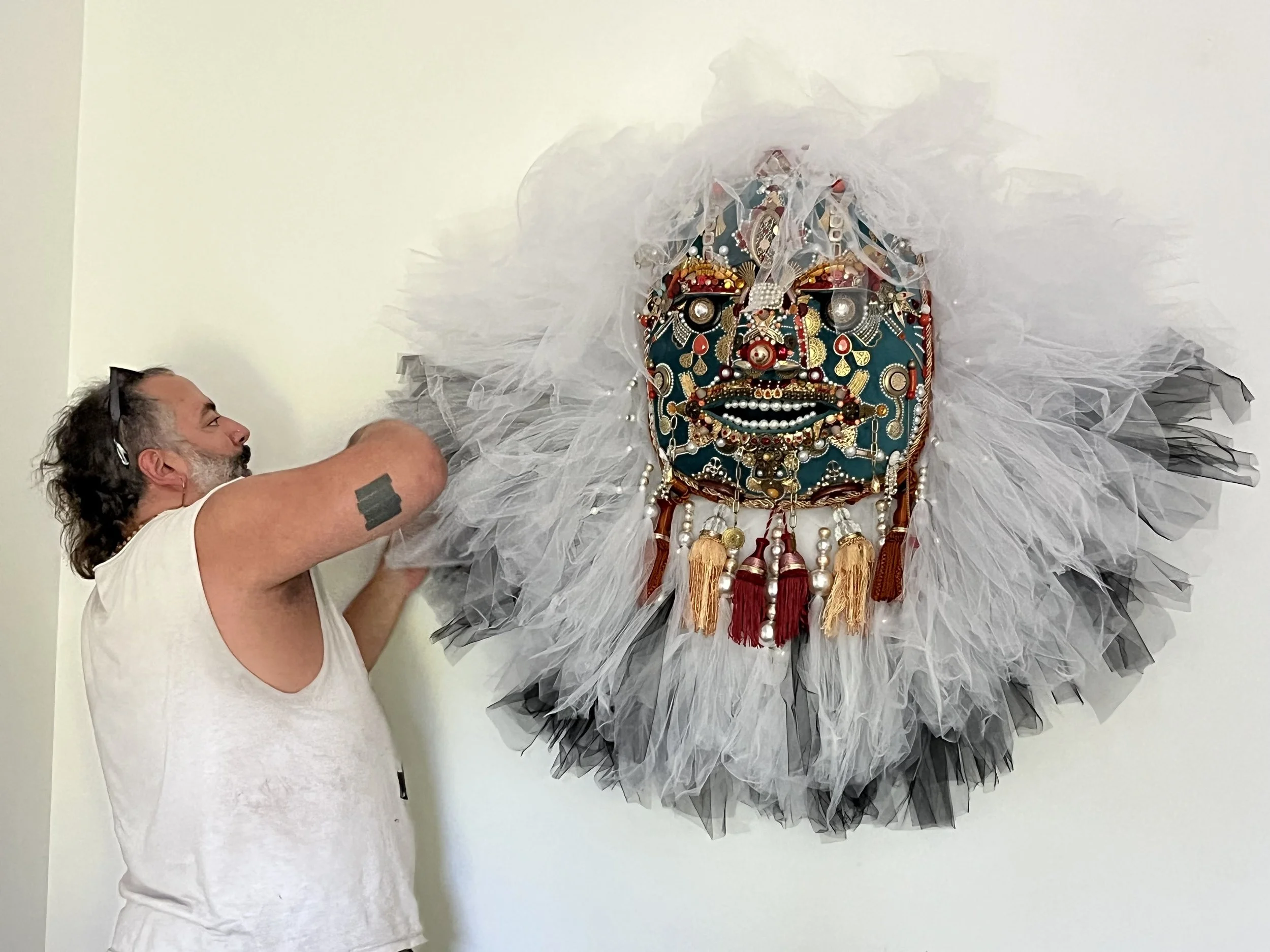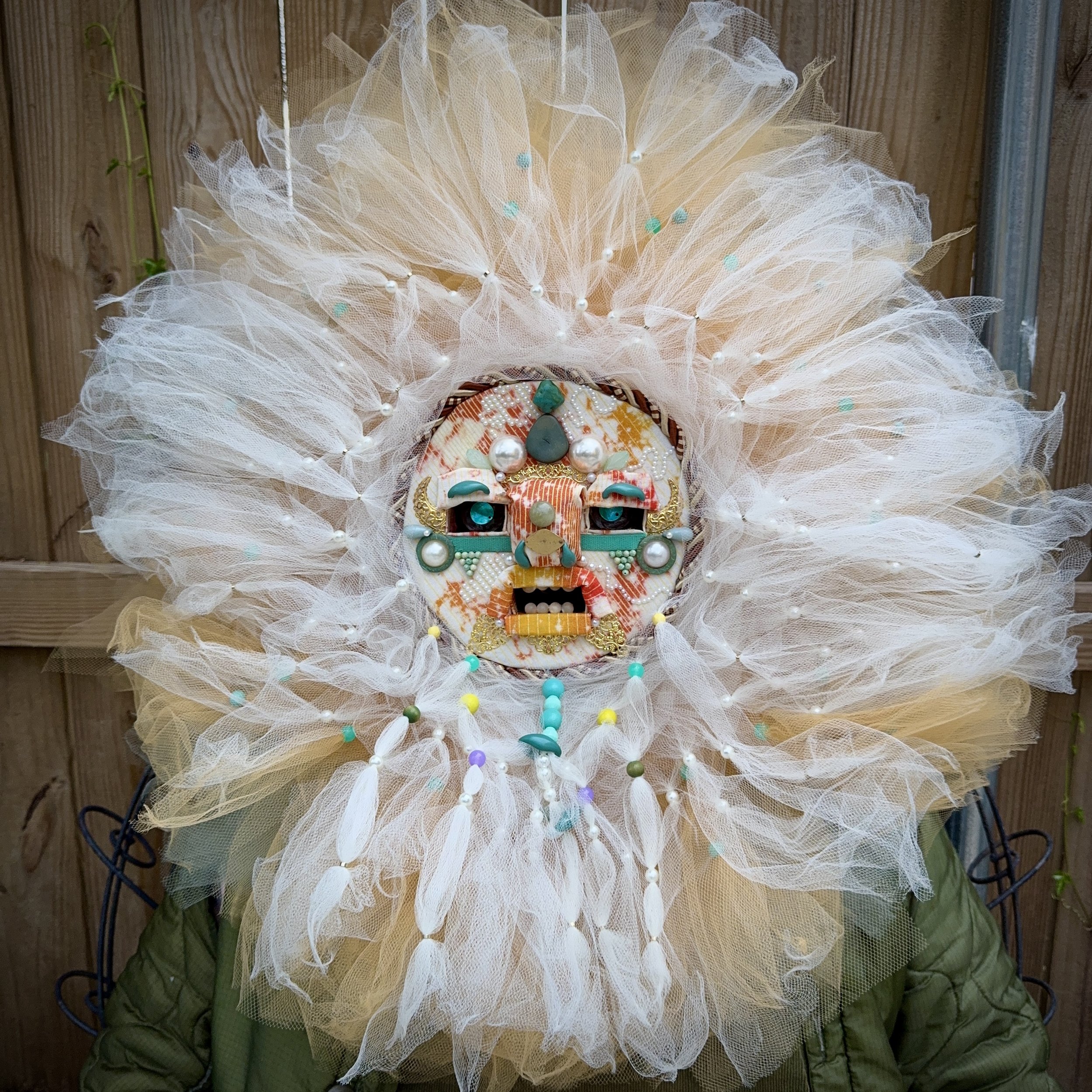 I use found objects and donated objects to adorn my masks with. This includes deconstructed costume jewelry, holiday decorations, scrapbooking effects, silverware, you name it. Sometimes I will purchase objects, but this is extremely rare. However, I typically purchase tulle, fabric, and the pearls you see adorning the masks - this is to ensure I always have them available.