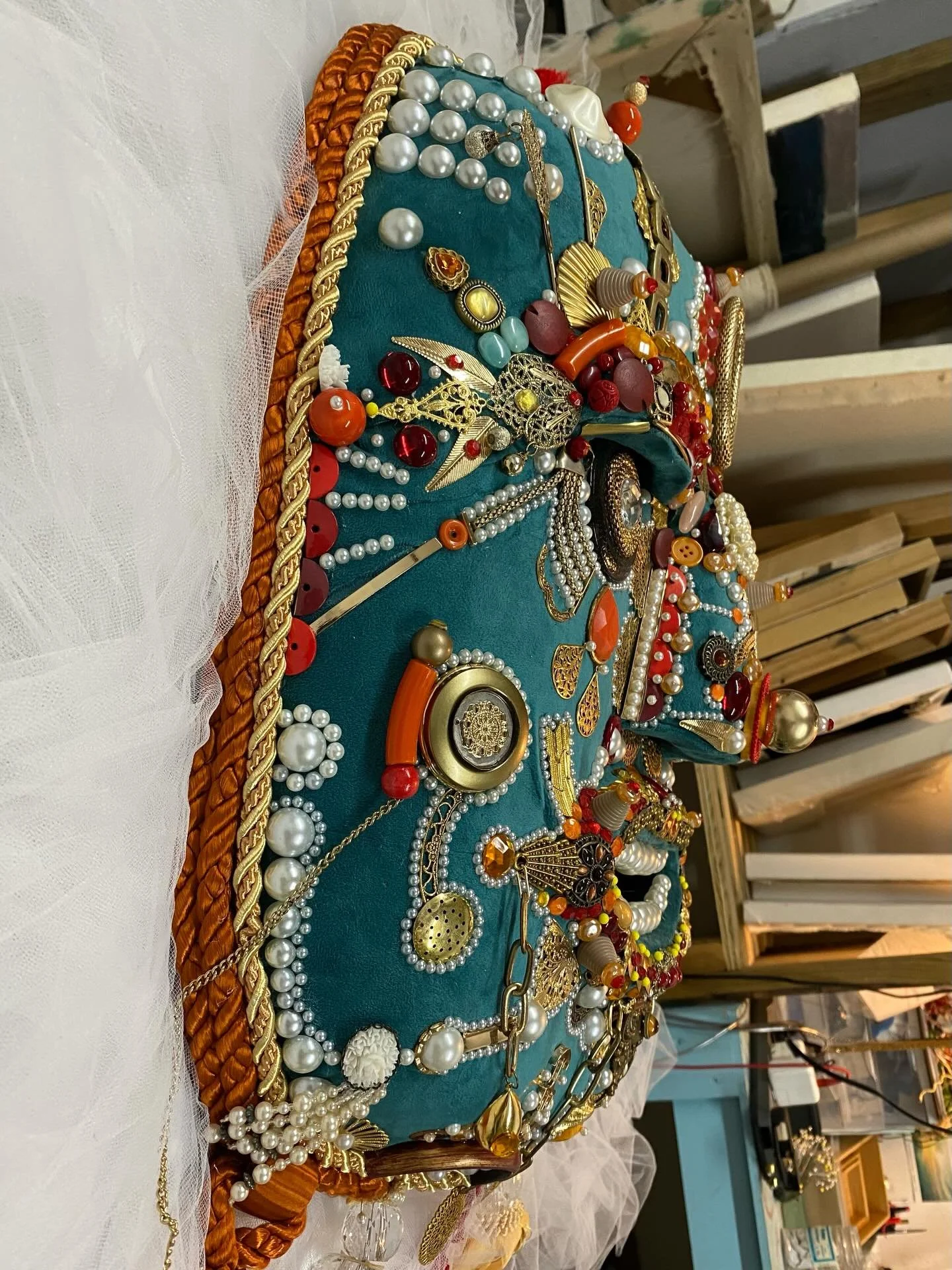 The face acts as a central anchor, while surrounding textile structures and found objects extend outward, transforming the mask into a fully dimensional form. The piece exists between wearable object and sculptural installation, functioning as both a physical artifact and a narrative presence.